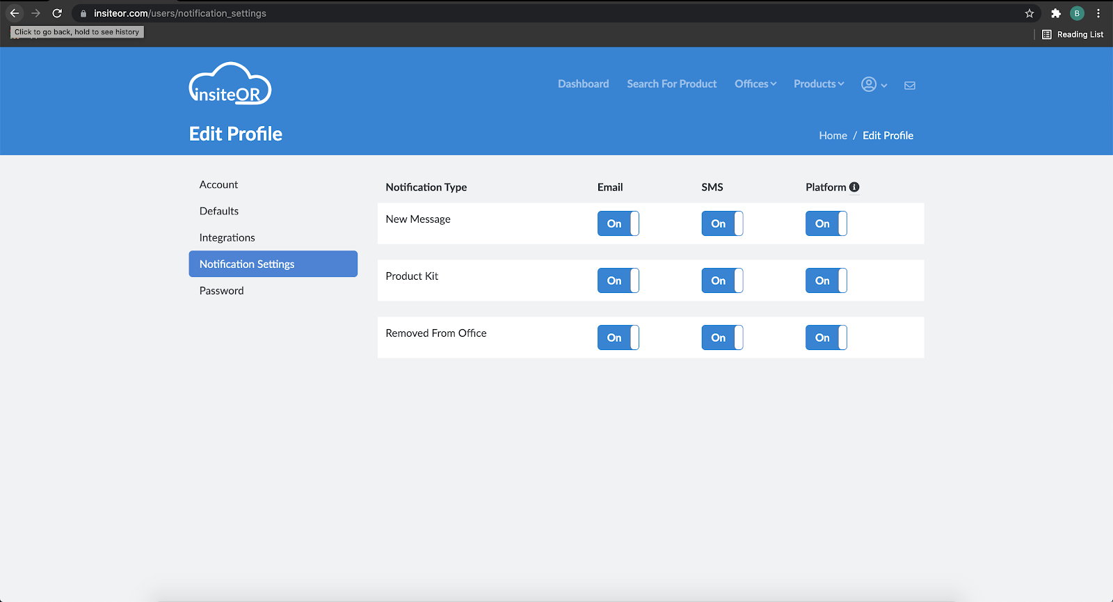 Toggle the types of Email, SMS, and Platform notifications you would like to receive on InsiteOR. This is for your profile only and does not apply to a group of profiles or users of a certain office.